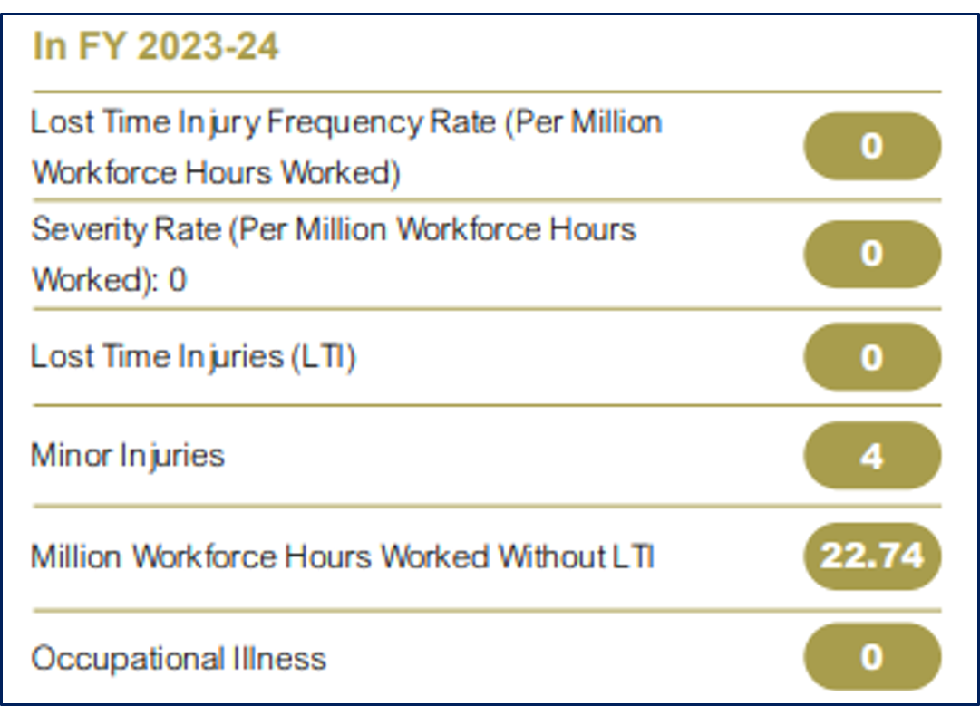 KNPL has a comprehensive OHS&E Policy, emphasizing health and safety across all operations and fostering a safety culture. The policy includes a Disciplinary Action for Safety Violation Policy aligned with KPJ guidelines to enhance safety awareness and adherence. A well-defined Safety Committee with worker representation conducts regular evaluations, promotes inclusive participation, and engages stakeholders. The company performs Process Hazard Analysis and Hazard and Operability Studies to identify and mitigate risks, ensures 100% compliance with chemical storage standards, and conducts periodic safety checks and training. Regular safety audits and assessments drive corrective actions, integrating safety training and competitions to create a safety-minded ecosystem, empowering the workforce to take ownership of safety and deploying robust safety measures across the organization. -